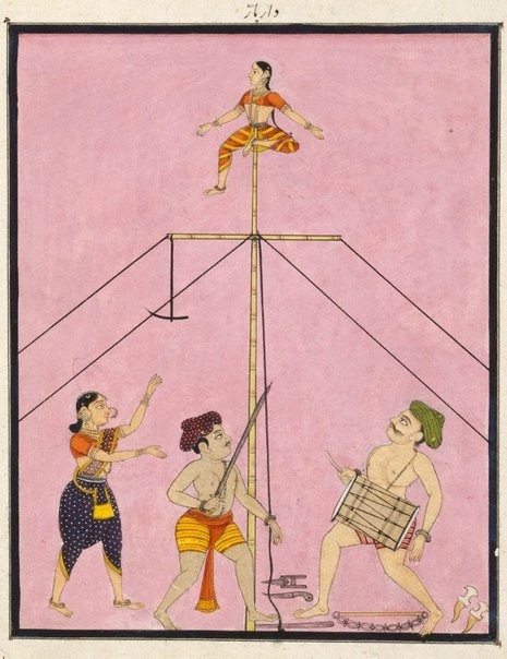 அதோ அவள் கம்பத்தின் உச்சியில் நிற்கிறாள். கீழே இருக்கிற ஆள். இவள் இனிப் பாயப்போகிறாள் என்பதைச் சொல்கிறான். அரசன் ஈந்த மோதிரம் அவன் கையில் இருக்கிறது. அதை வீசப்போகிறான். கம்பத்தின் உச்சியில் இருப்பவள் மீன்கொத்தியைப் போலப் வாய்ந்து அந்த மோதிரத்தைக் கவ்விக்கொண்டு, தரையில் குதிக்காமல் கம்பத்திலேயே ஒட்டிக்கொள்ளப் போகிறாள். அது எப்படி முடியும்? மோதிரத்தைப் பற்றிக் கொண்டு உடனே கம்பத்தைப்பற்றிக் கொள்வது எப்படி?